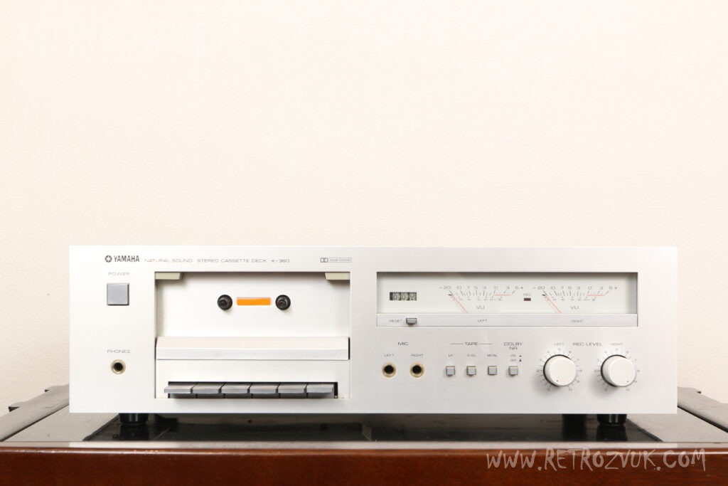 Основные характеристики Yamaha K-360: 2 головки, механический трехзначный счетчик кассет, ручной выбор типа ленты и возможность использования обычных, хромовых и металлических кассет, транспорт с приводом от ремня и одним капстаном.