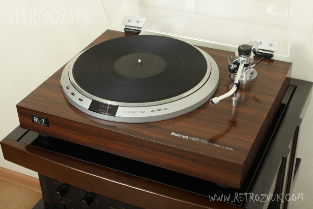 Проигрыватель виниловых пластинок с поворотным столом TT-71. Оборудован кварцевым сервоприводом. Привод оснащен следящей системой FG. Механизмом для определения скорости вращения. Магнитный диск вращается вместе с двигателем. Катушка со 180 витками. Поворотный стол с резиновым покрытием обладает весом в 2,2 кг и плавным вращением. Автоматический замок цепи, точная частота колебаний сердечника. Отклик сервопривода быстрый использована схема от VICTOR собственной разработки. Система оснащена детектором скорости вращения и сенсорными датчиками. Тормозной механизм плавный с использованием электромагнитного соленоида способен остановить опорный диск за 1,6 сек. Тонарм с карданной поддержкой для стабильной работы, обладает высокой чувствительностью. Разъём головки с зажимами для блокировки, чтобы предотвратить возможные колебания иглы. Сама же головка кованая.