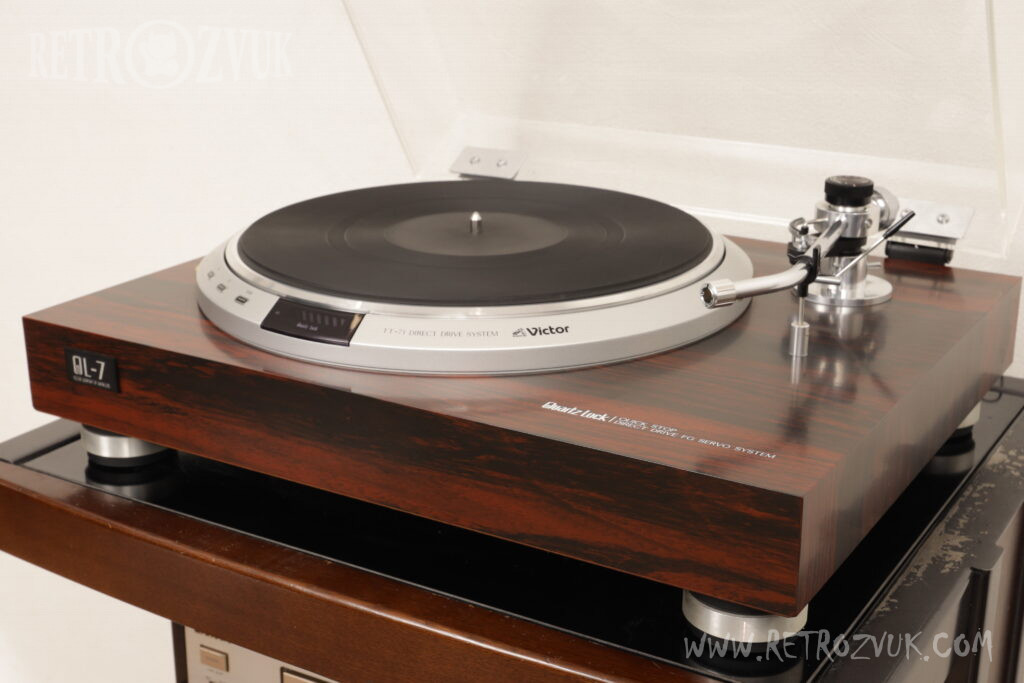 Проигрыватель виниловых пластинок с поворотным столом TT-71. Оборудован кварцевым сервоприводом. Привод оснащен следящей системой FG. Механизмом для определения скорости вращения. Магнитный диск вращается вместе с двигателем. Катушка со 180 витками. Поворотный стол с резиновым покрытием обладает весом в 2,2 кг и плавным вращением. Автоматический замок цепи, точная частота колебаний сердечника. Отклик сервопривода быстрый использована схема от VICTOR собственной разработки. Система оснащена детектором скорости вращения и сенсорными датчиками. Тормозной механизм плавный с использованием электромагнитного соленоида способен остановить опорный диск за 1,6 сек. Тонарм с карданной поддержкой для стабильной работы, обладает высокой чувствительностью. Разъём головки с зажимами для блокировки, чтобы предотвратить возможные колебания иглы. Сама же головка кованая.
