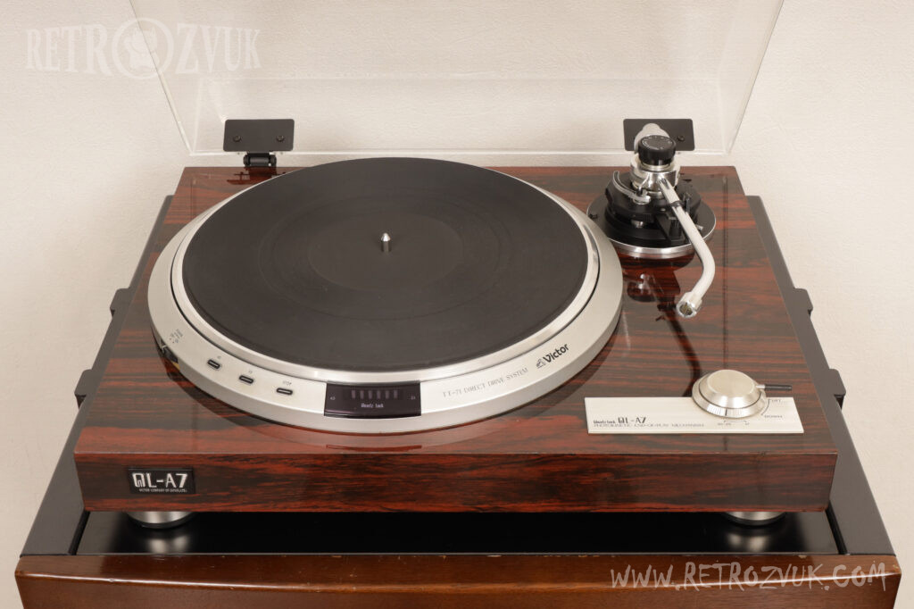 Эта модель относится к «золотой» эре аудио. Ее выпуск пришелся на конец 70-х годов, когда проигрыватели винила стали постепенно вытесняться магнитофонами и кардинально поменялся подход к конструкциям звуковоспроизводящих устройств. Компания Victor (JVC) отреагировала на веления времени и добавила в модель QL-A7 катушки с магнитными датчиками, электронные элементы управления в замкнутых контурах.