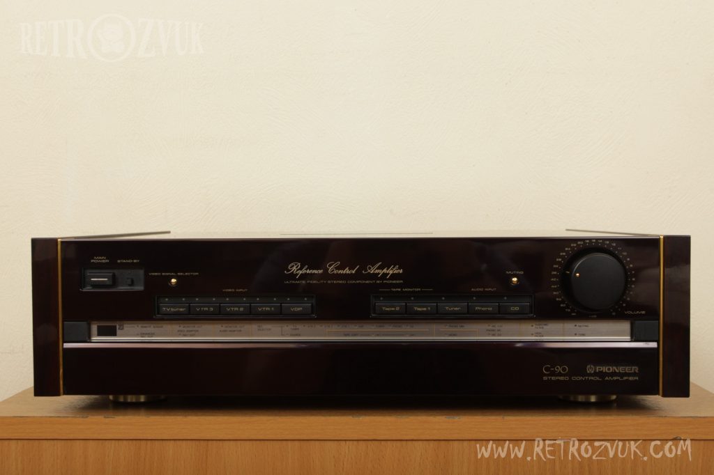 Стереоусилитель Pioneer C-90 с оригинальным дизайном и простой концепцией. Блок питания с трансформатором двойной конструкции, питание, разделённое для частей схемы, за счет чего работа более стабильна и устойчива к помехам. За счет использование второго трансформатора, работа от цепи напряжения более надежная. Схема оснащена автоматическим отключением при переизбытке мощности.
