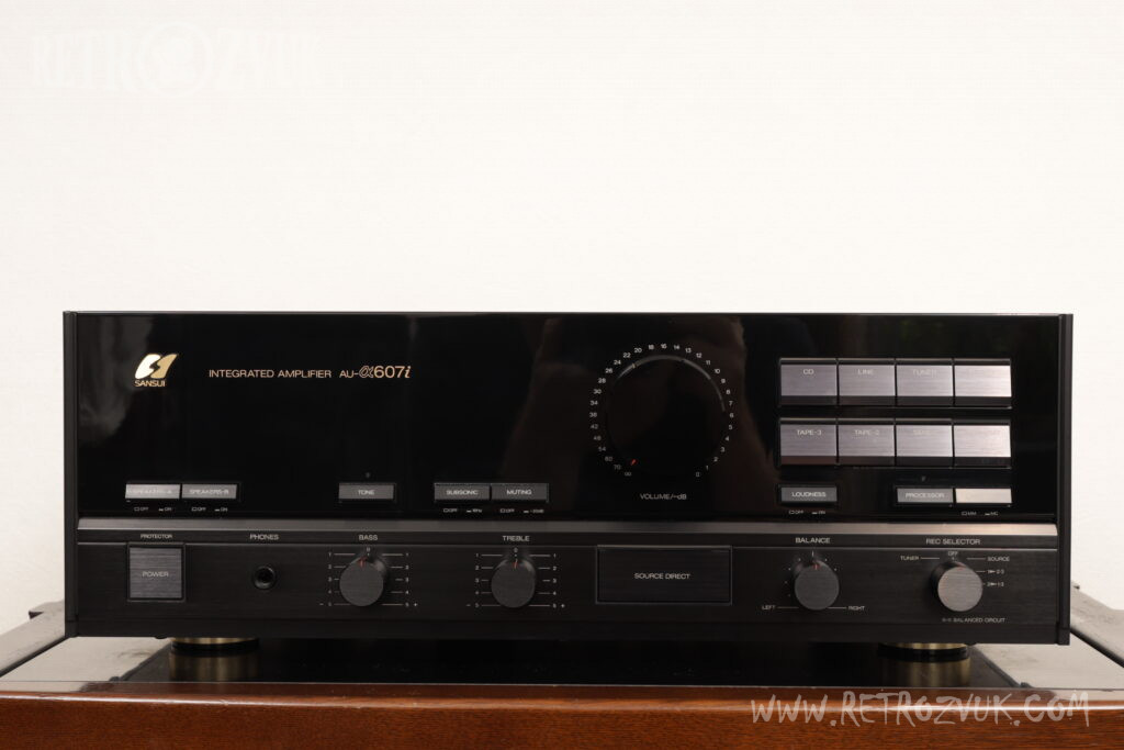 Стерео усилитель мощности SANSUI на основе схемы баланса α-X. За счет использования данной схемы шум и искажение от заземления сведены к минимуму, каналы независимы. Входной каскад блока питания представляет собой дифференциальный симметричный вход на базе малошумящего полевого транзистора. За счет схемы α-X предотвращено искажение IHM.