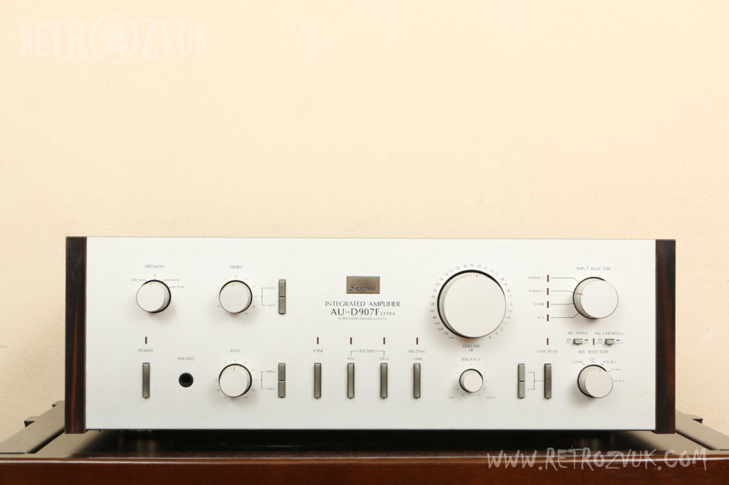 В AU-D907F EXTRA используются полупроводниковые MOS-FET транзисторы. Скорость переключения биполярного транзистора в 5 раз быстрее предшественника, это улучшило стабильность сигнала. Схема с MOS-FET транзисторами обладает отличной устойчивостью, широкополосными характеристиками в широком диапазоне температур. На входе стоит дифференциальная схема с полевыми транзисторами для того что бы свести к 0 возможные искажения TIM. Используется МС трансформатор с линейным шагом, технологии Sansui и специальная сбалансированная обмотка с дополнительным подавлением шума.
